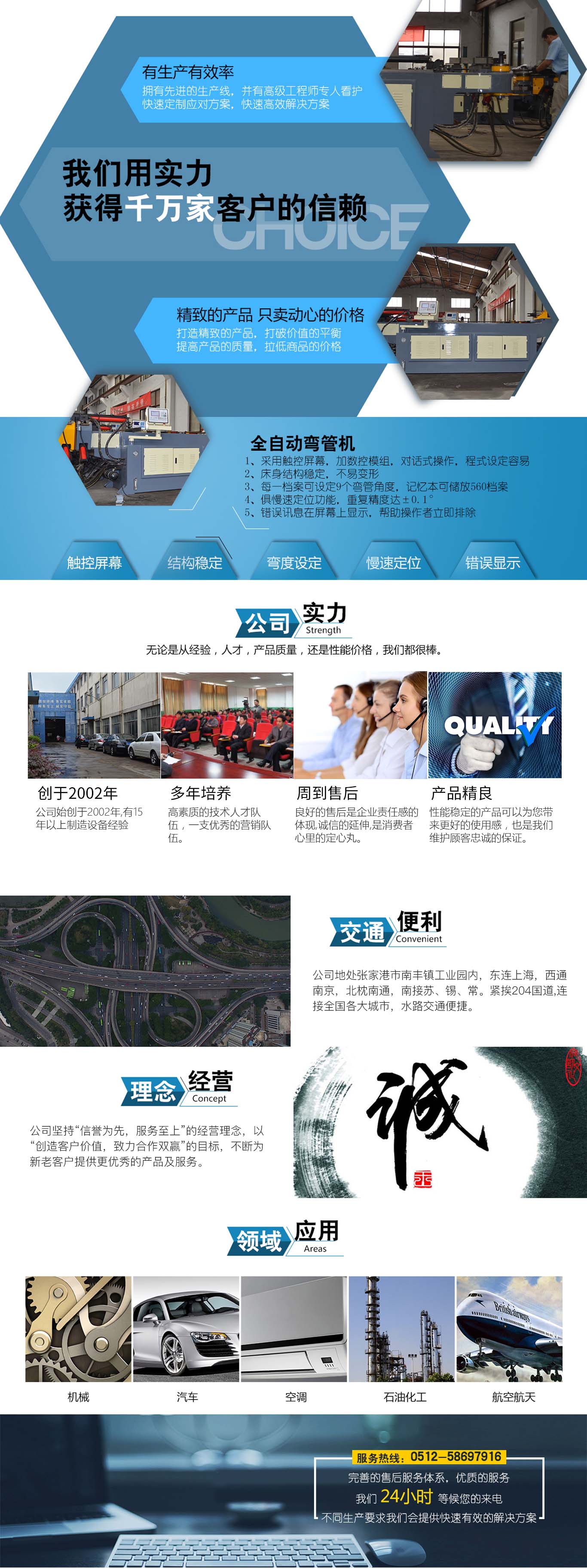 張家港市雙和機械制造有限公司始建于2001年,占地面積12000平方米,南鄰蘇州、無錫、上海,東鄰常州、南京,交通便利,位長三角中間地段,風景優美的張家港。 雙和公司至創立開始,引進了國外的設計制造理念,組建了企業生產管理優秀團隊,致力于管材加工機械研發、設計、制造。創新的設計理念,嚴格的質量把關,專業的售后服務,不斷提升了我在整個行業的影響力。 雙和公司生產的系列產品分為彎管機、切管機、縮管機、磨齒機、伺服彎管機、數控彎管機、液壓彎管機、自動切管機、管端成型機、倒角機、大弧滾圓機、鋁切機、壓彎機等管材加工機械,廣泛用于航天業、造船業、汽車制造、鍋爐制造、自行車、摩托車、體育健身器材、管制品家...